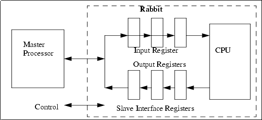 The slave port is designed to allow the Rabbit to be a slave to another processor, which could be another Rabbit. The port is shared with parallel port A and is a bidirectional data port. The master can read any of three registers selected via two select lines that form the register address and a read strobe that causes the register contents to be output by the port. These same registers can be written as I/O registers by the Rabbit slave. Three additional registers transmit data in the opposite direction. They are written by the master by means of the two select lines and a write strobe.