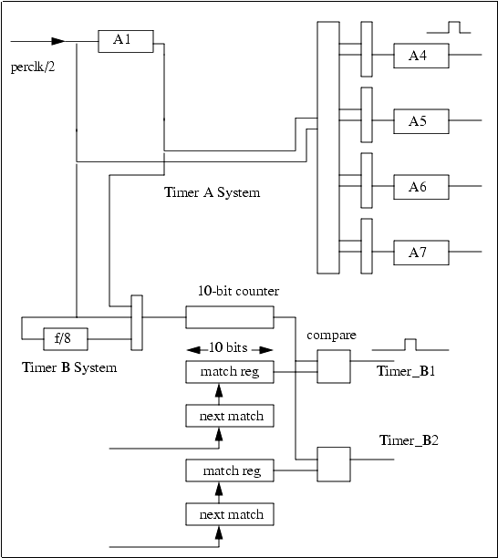 The Rabbit has several timer systems. The periodic interrupt is driven by the 32.768 kHz oscillator divided by 16, giving an interrupt every 488 µs if enabled. This is intended to be used as a general-purpose clock interrupt. Timer A consists of five 8-bit countdown and reload registers that can be cascaded up to two levels deep. Each countdown register can be set to divide by any number between 1 and 256. The output of four of the timers is used to provide baud clocks for the serial ports. Any of these registers can also cause interrupts and clock the timer-synchronized parallel output ports. Timer B consists of a 10-bit counter that can be read but not written. There are two 10-bit match registers and comparators. If the match register matches the counter, a pulse is output. Thus the timer can be programmed to output a pulse at a predetermined count in the future. This pulse can be used to clock the timer-synchronized parallel-port output registers as well as cause an interrupt. Timer B is convenient for creating an event at a precise time in the future under program control.