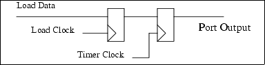 Stores to the port are loaded in the first-level register. That register in turn is transferred to the output register on a selected timer signal. The timer signal can also cause an interrupt that can be used to set up the next bit to be output on the next timer pulse. This feature can be used to generate precisely controlled pulses whose edges are positioned with high accuracy in time. Applications include communications signaling, pulse width modulation and driving stepper motors.